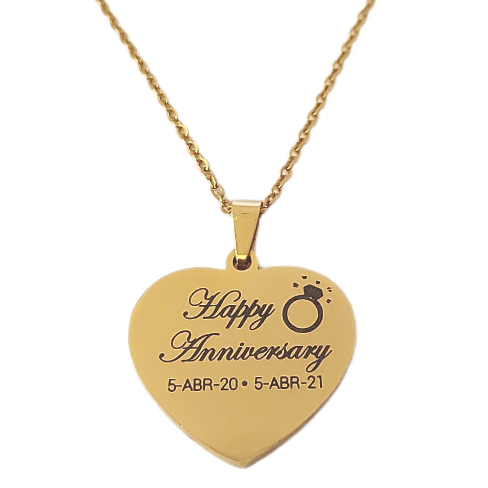 1 Dije en forma de Corazón de acero inoxidable en acabado dorado Grabado por ambas caras con las indicaciones que usted nos proporcione (Podemos grabar texto, símbolos o diseños en vectores, lineas y rellenos) Tomar en cuenta que entre mas información se grabe la letra quedara mas pequeña y por lo tanto mas difícil de leer)