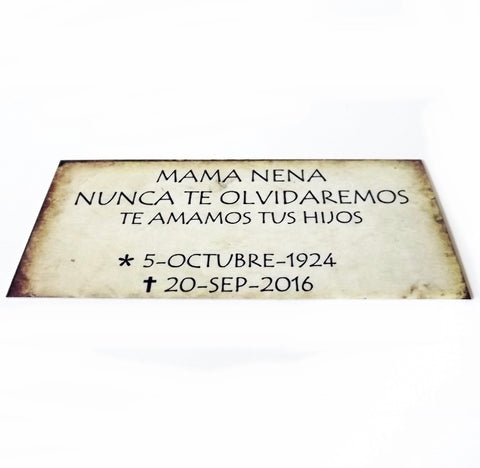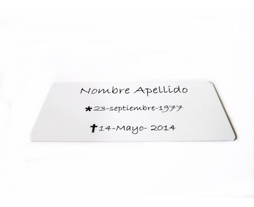 Placa de Urna de Aluminio 100 % Personalizable . La medida estándar que usamos es de 8 cm de largo por 4 cm de ancho. Si requiere alguna otra medida la podemos hacer solo comentalo en la sección contacto para darle una cotización.